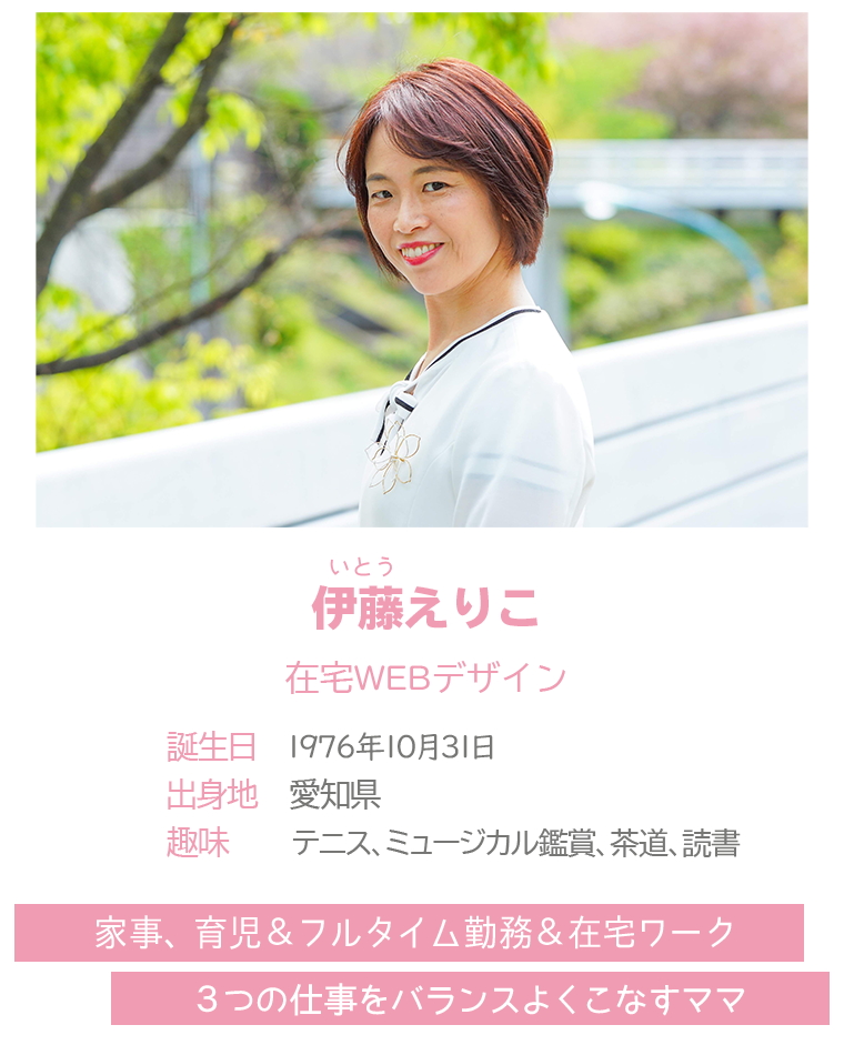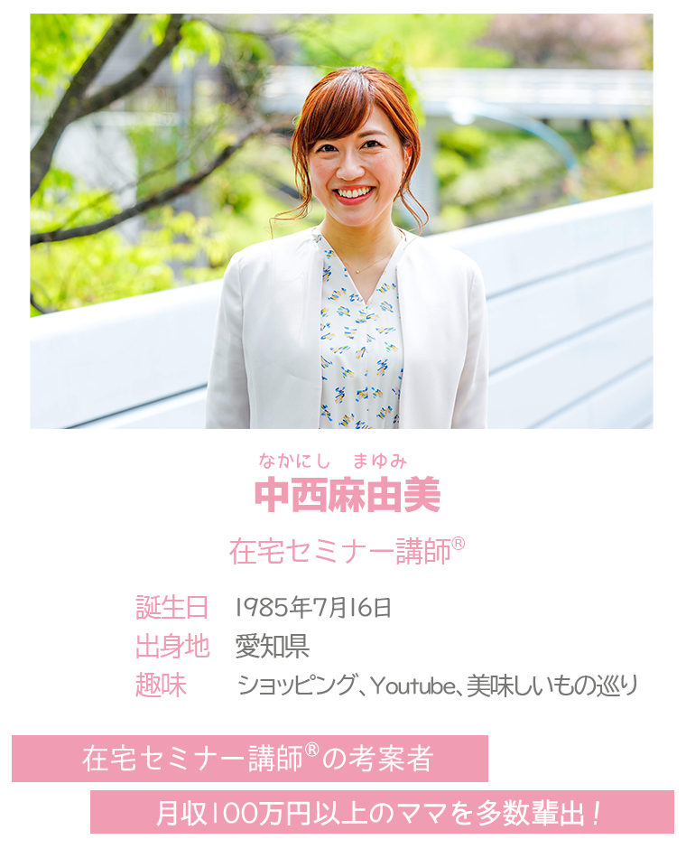 その後、妊娠を期にセミナーが自宅完結でできないかを考え、『在宅セミナー講師という働き方』を考案。現在は、「ママの働き方、女性の生き方を変える!」というミッションのもと、『ママのミカタ』学校の講師を務める。
